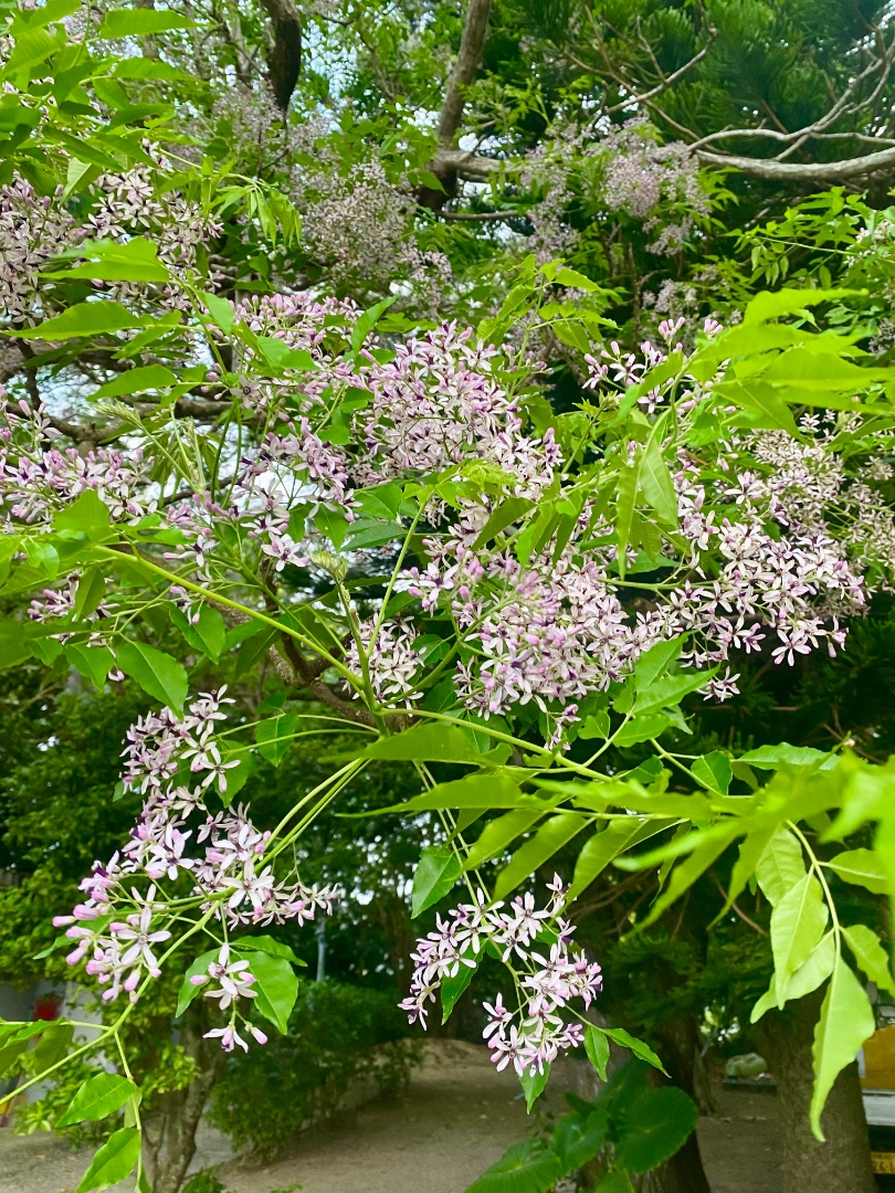センダンの花がヤラマスに停めた車の上に雪化粧のように